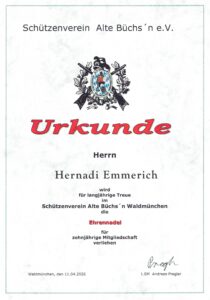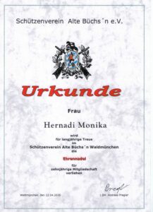 Bei der am 23. Juni 2019 ausgetragenen Bayerischen Meisterschaft des Oberpfälzer Schützenbundes e. V. 1889, erreichte Monika Hernadi, Alte Büchs’n Waldmünchen, im Wettbewerb Luftpistole (aufgelegt), in ihrer Altersklasse, den 1. Platz (mit 300,7 Ringen) und erhielt die Gold-Medaille.