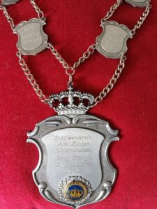 Bei der Königsproklamation wurde ich mit einem Teiler von 64,2 zum Schützenkönig aufgelegt „geadelt“. Diese Königskette trage ich bis nächstes Jahr mit Stolz.